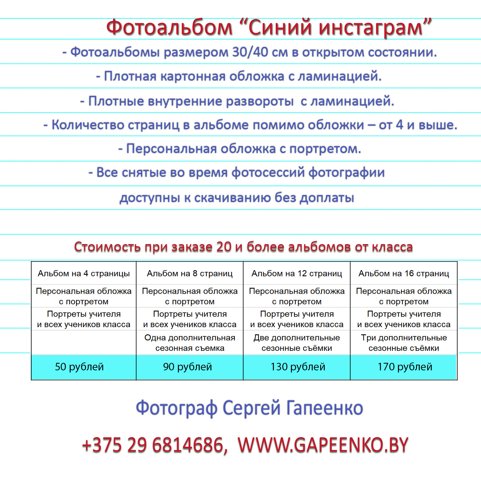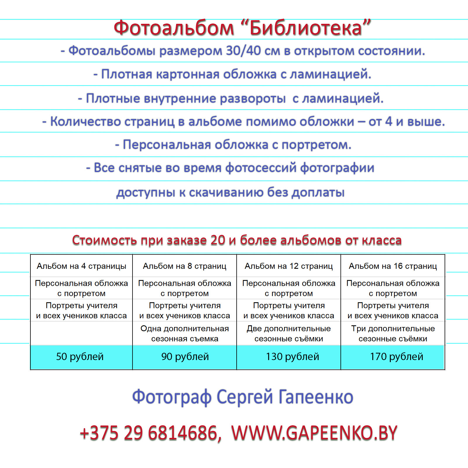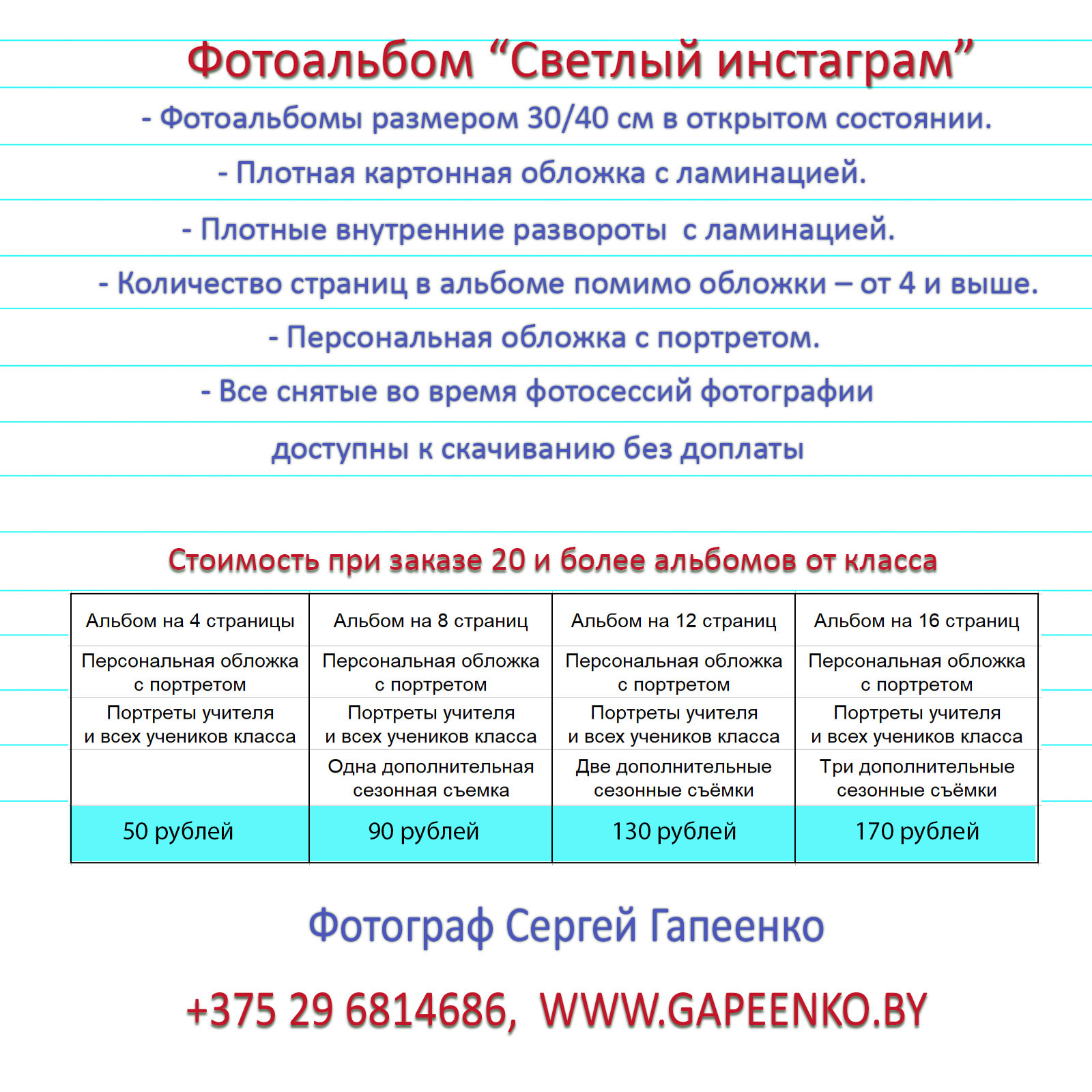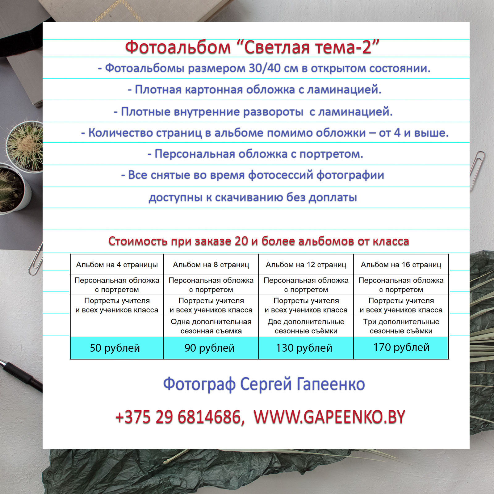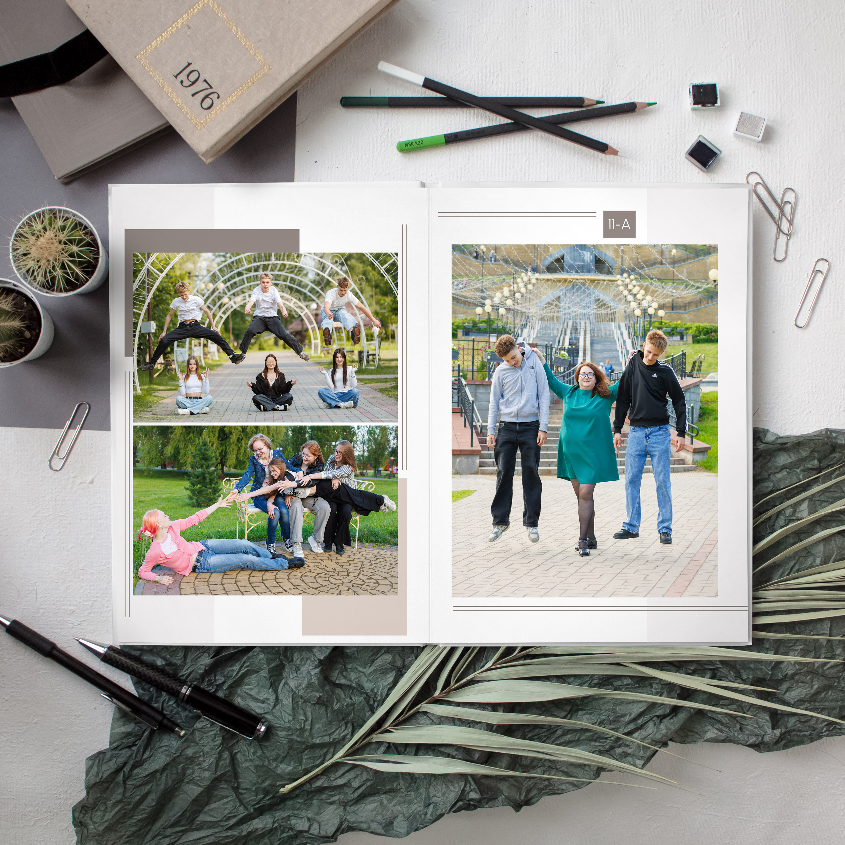 - Количество страниц в альбоме - от 2 до 16 в зависимости от количества фотосъемок и выбранного макета.